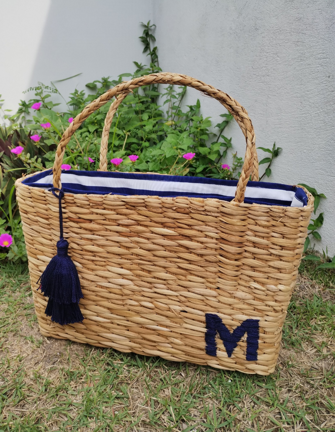 A maravilhosa Bolsa Navy, é uma bolsa em um tamanho padrão, excelente para carregar seus objetos, toalha e canga, feita com palha natural da taboa, um clássico, com sua inicial bordada a mão com barbante 100% algodão. Seu forro em tecido impermeável ou em tecido 100% algodão a depender da cor que desejar, possui bolso interno para objetos menores.